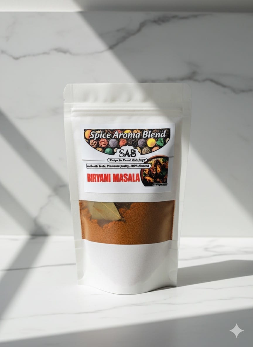 *Premium Biryani Masala by Spice Aroma Blend* is a masterfully crafted blend of high-quality whole spices designed to bring authentic aroma, rich flavor, and restaurant-style perfection to every biryani. Each spice is slow-roasted and freshly ground to preserve its natural oils, ensuring deeper fragrance and a traditional taste you can smell the moment you open the pack.